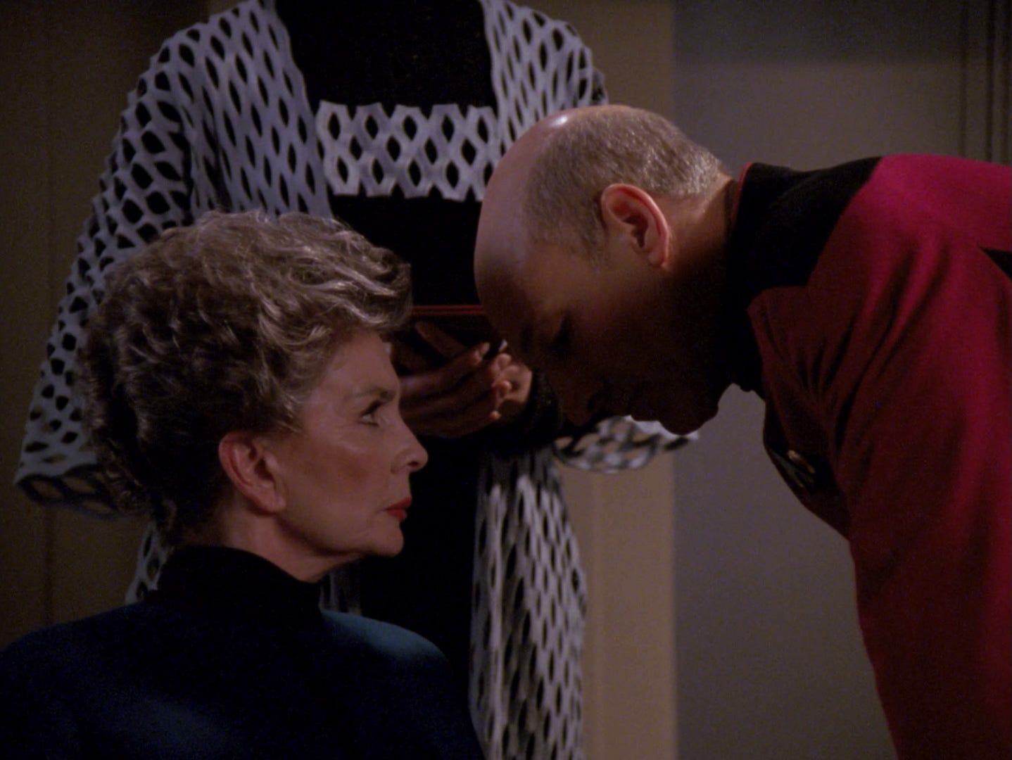 It was one of those rare hours of television that became literature. Jeri Taylor’s story, Jonathan Frakes’ directing and superb performances all around — especially those by Patrick Stewart and guest star Jean Simmons as the retired admiral, Norah Satie — came together to rise to a level of excellence rarely seen even among the best of Star Trek.